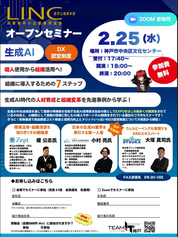 生成AIの社会実装を通じて産業の再構築を目指す生成AI活用普及協会の顔としてEXPOをはじめ数多くの講演をされている小林氏と、AI顧問として実際の現場に即したAI導入サポートやAI開発をされている榎氏のコラボセミナーです!さらに!税制優遇で資金調達コスト削減と信用力向上とメリットいっぱいのDX認定制度について大塚氏から解説!