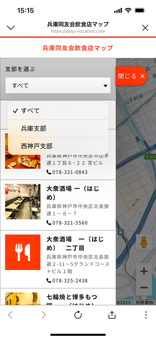 兵庫同友会の会員の方をターゲットに、会員のカフェやレストラン、居酒屋、バー、ラウンジなど、飲食店を紹介する飲食店マップシステムです。